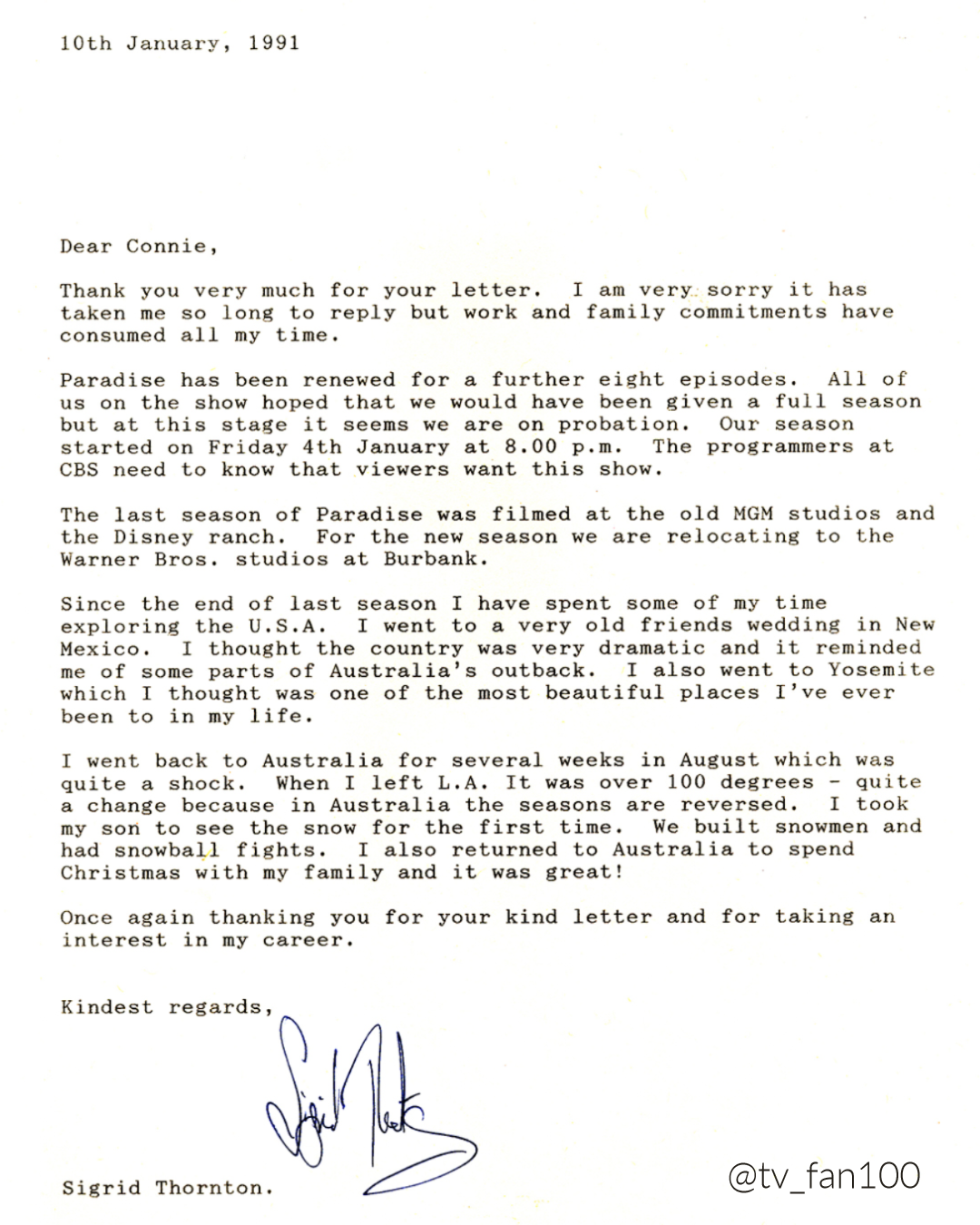 I became a Sigrid Thornton fan when I first watched Paradise which aired in the US on CBS from 1988 to 1991. At the time I wrote a fan letter (my first and one of only six in my life) and received this lovely reply. I recently decided to create this fan site in appreciation of Sigrid's work and to share with other fans. Hope you like it! If you have anything you'd like to share please e-mail me at sigridthorntonfan@gmail.com Sigrid Thornton Fan webmaster